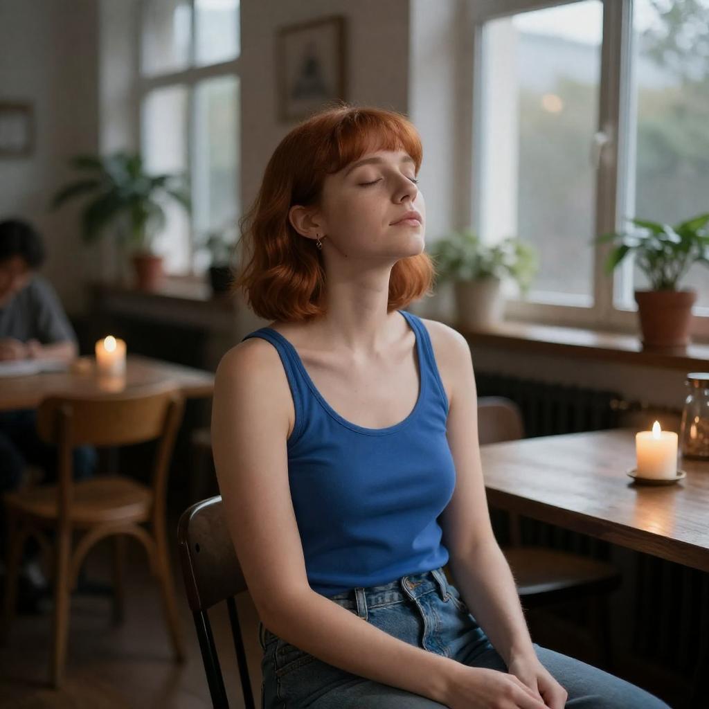 Woman with short red hair, wearing a blue tank top, seated in a chair with eyes closed, head tilted back. Candle on table to the right. Dimly lit room with large windows, potted plant, and another person in background.