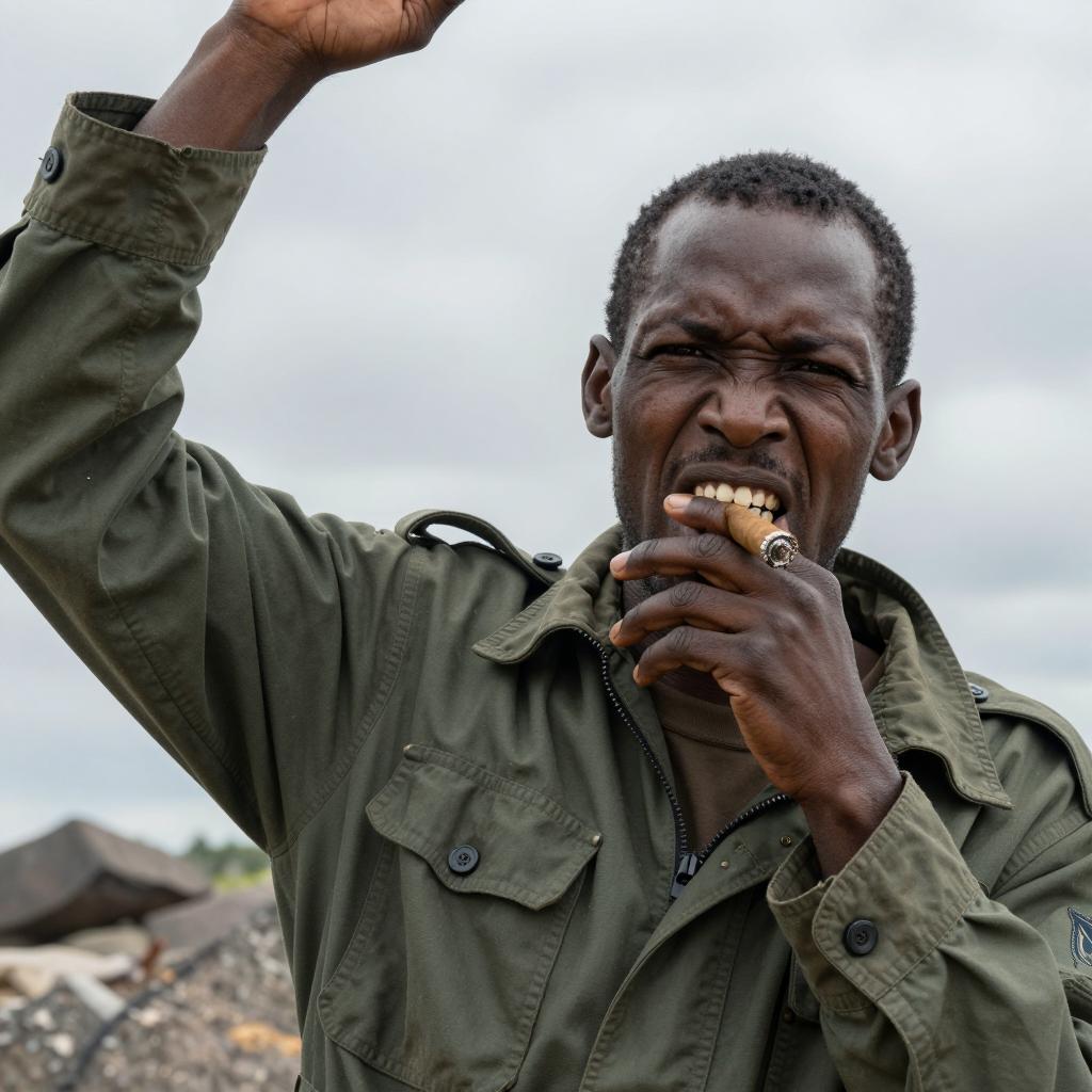 A black man with short hair, wearing a green military jacket, gritting his teeth and biting a cigar. His right arm is raised, and his jacket has visible wear and tear. The background shows a cloudy sky and a rocky surface. The man's expression is intense and determined.