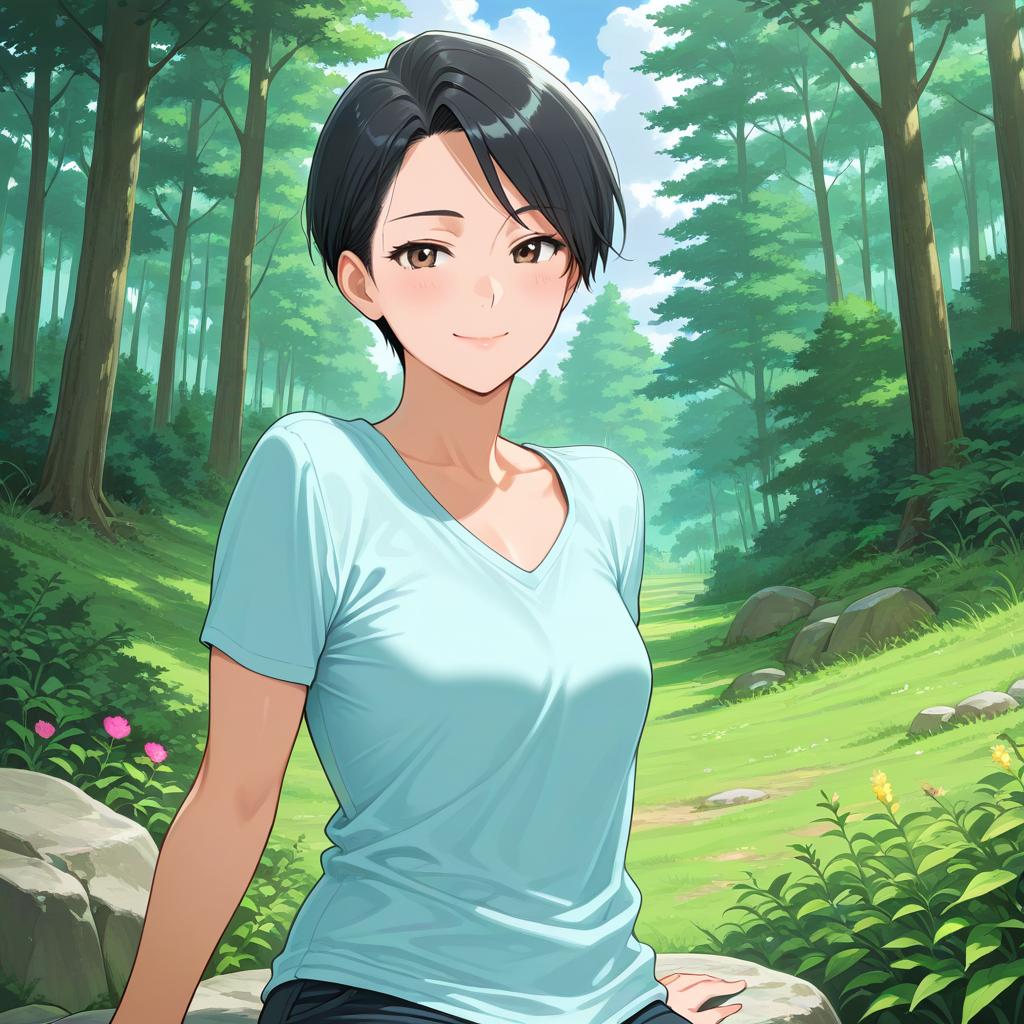 Anime-style digital drawing of a smiling woman with short black hair, wearing a light blue t-shirt, standing in a lush, sunlit forest.