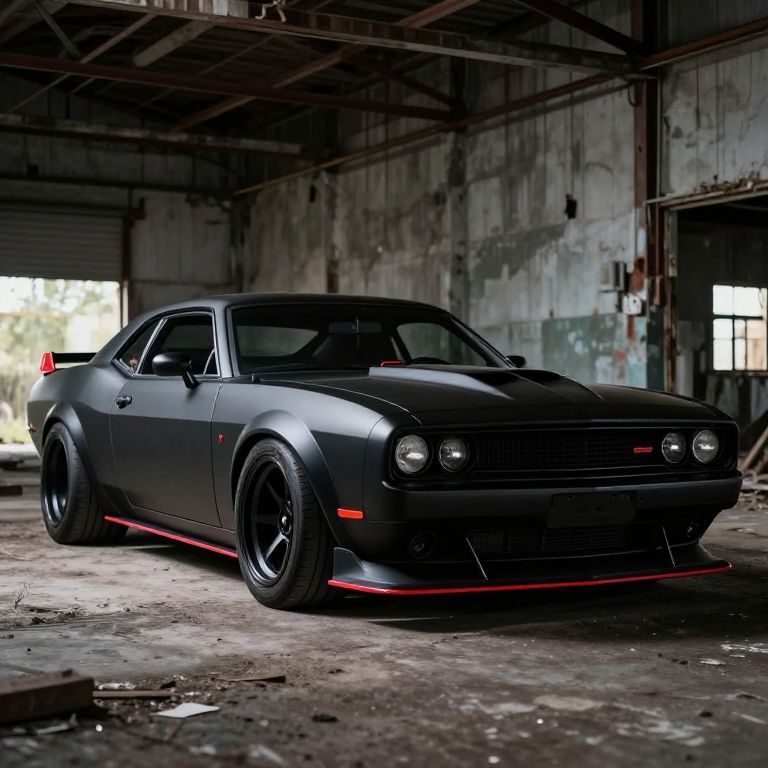 Tunado muscle car parked in an abandoned warehouse, gritty urban decay setting, matte black paint with red accents, wide body modifications, lowered suspension, bold front grille, dramatic lighting casting deep shadows, emphasizing raw power and underground street culture.