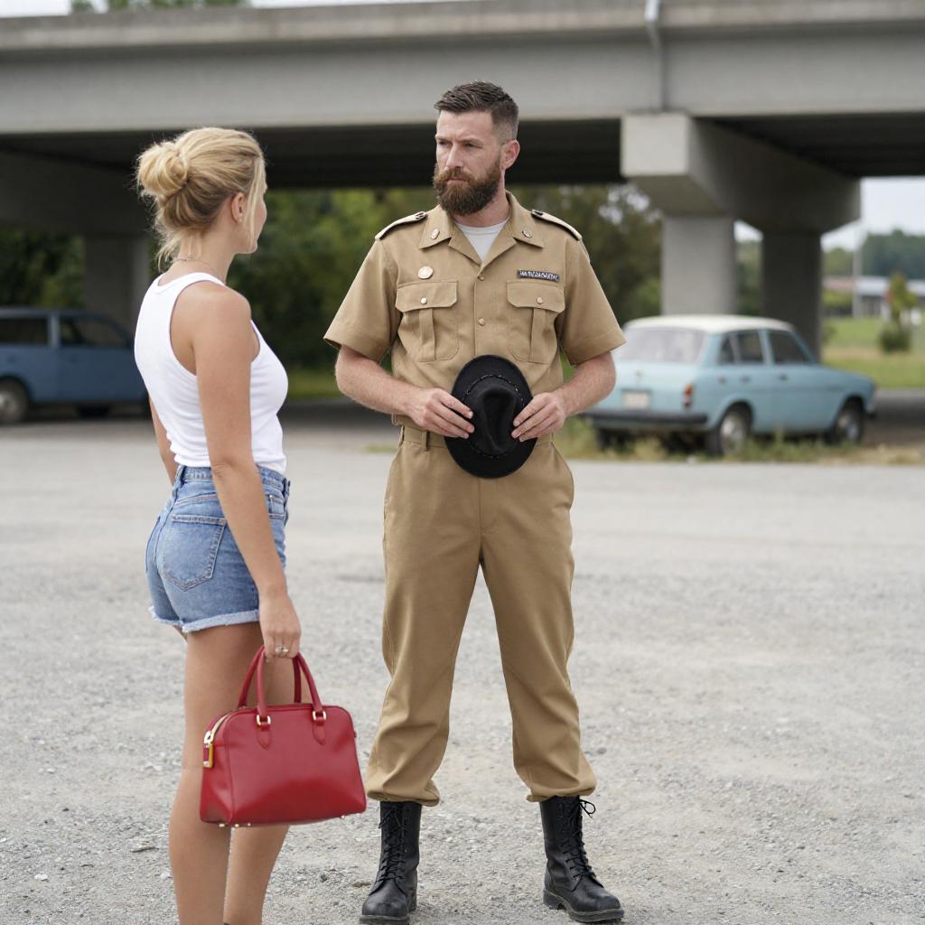 Photograph of a bearded man in a tan military-style uniform holding a black hat, standing and looking at a blonde woman with a bun, wearing a white tank top, denim shorts, and a red handbag. They are on a gravel lot under an overpass with greenery and old vehicles in the background.