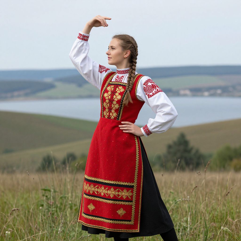 Photograph of a young Caucasian woman with light skin and long brown hair in a braid, standing in a grassy field. She wears a traditional red and black embroidered dress with white sleeves and red embroidered patterns on the cuffs and collar. Her right arm is raised, pointing upwards, and her left hand rests on her hip. The background features a serene, expansive landscape with rolling hills, a lake, and a blue sky. The dress has intricate gold embroidery, and the scene exudes a rustic, cultural vibe.