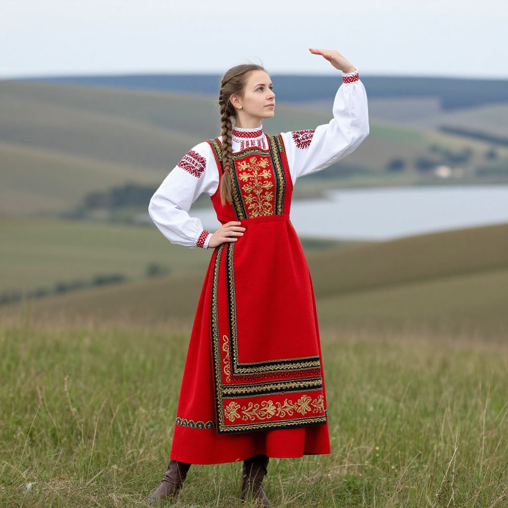 Photograph of a blonde woman in a red and black traditional Eastern European dress, standing in a grassy field with a lake and hills in the background