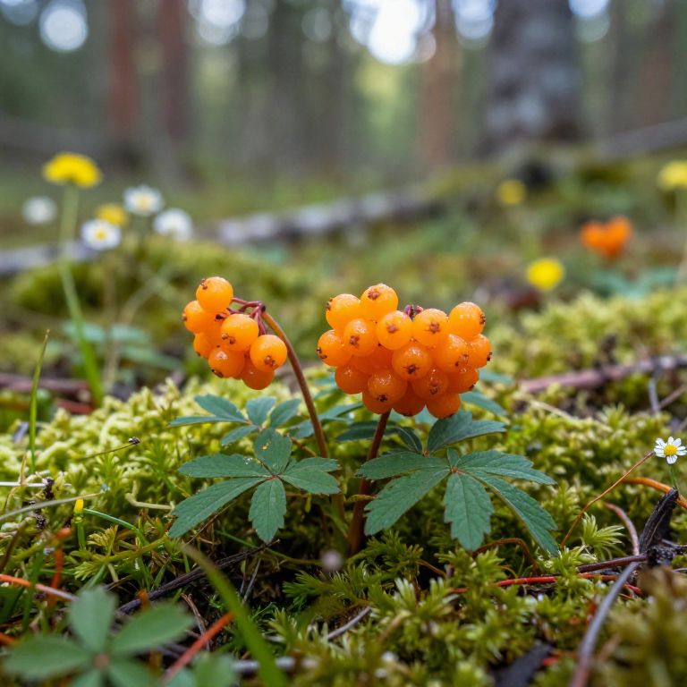 Cloudberry growing in a lush Nordic forest clearing, golden orange berries glistening under soft morning light, surrounded by green moss and small wildflowers, ultra-detailed nature close-up, vibrant colors, realistic texture