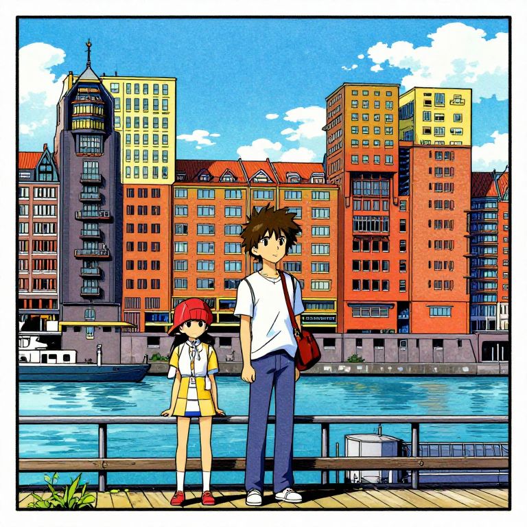 Accent Wall style of homestuck and makoto shinkai, Rotterdam city centre with harbour in background, ink and brush style, brilliant colors, intricate detail,