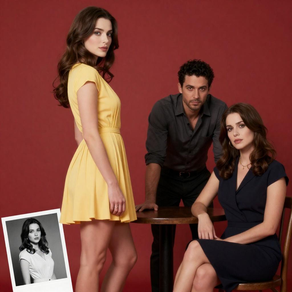 Photograph-style movie poster with a red background. A woman in a short, yellow, pleated dress stands to the left, looking over her shoulder. To the right, a man in a dark shirt leans over a table, while a woman in a dark dress sits beside him. A small black-and-white photo of the same woman is in the bottom left corner.