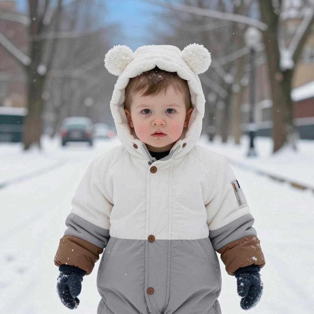 Baby boy snowsuit costume, photorealistic portrait of young boy, winter parka, hood up, snow-covered park, daytime, trees in background, blue sky, light snowfall, child with fair skin, brown hair, serious expression, buttoned parka, white and gray jacket, brown and gray striped sleeves, brown buttons, standing in snow, park path, blurred cars in background, natural light, winter setting, realistic ures, photograph, clear focus on child, background slightly blurred
