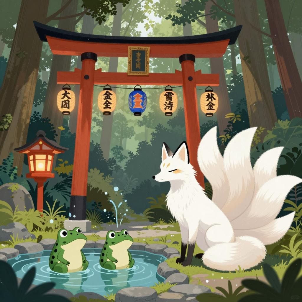 Illustration of a white fox with red markings and a red ribbon around its neck, standing on stone steps. The fox has sharp, intense red eyes and a stern expression. Background includes a large red torii gate and a traditional Japanese shrine with a green roof, set in a forest with tall trees. Fox sits on a raised stone platform in the foreground.