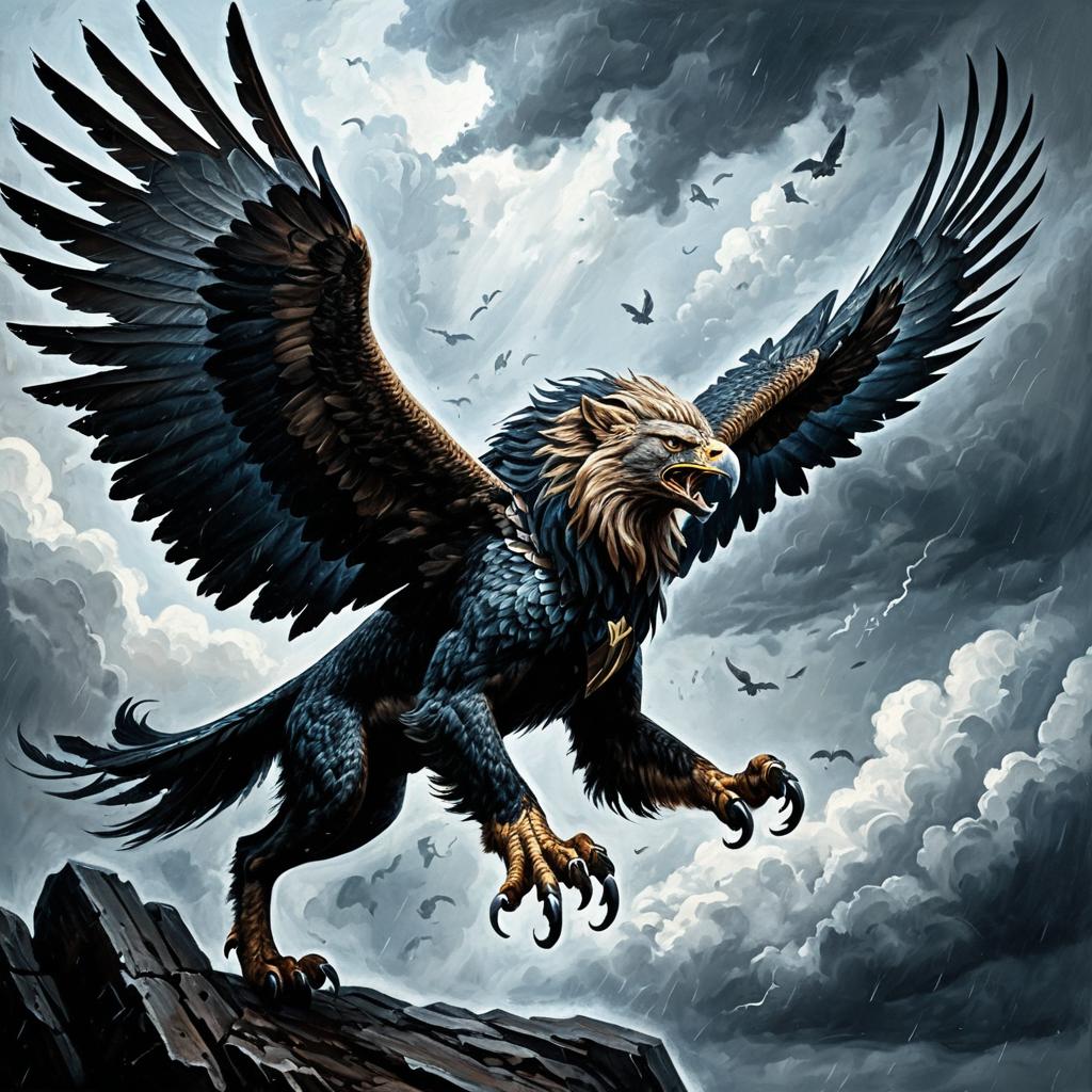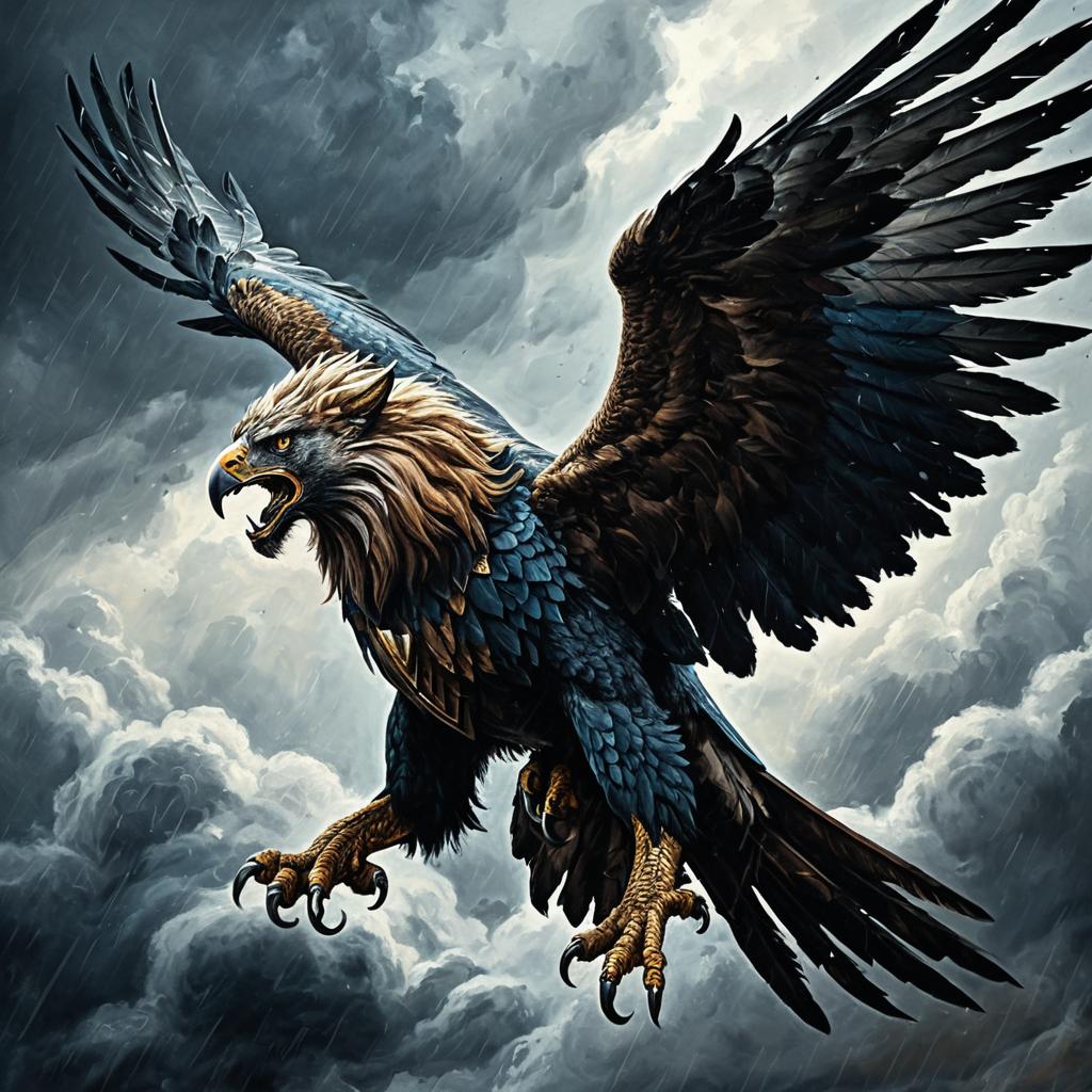 Oil painting of a majestic griffon with the body of a lion and head and wings of an eagle, soaring against a dramatic stormy sky. The artwork features rich textures and muted blue and gray tones, highlighting the creature's powerful and mythical presence.