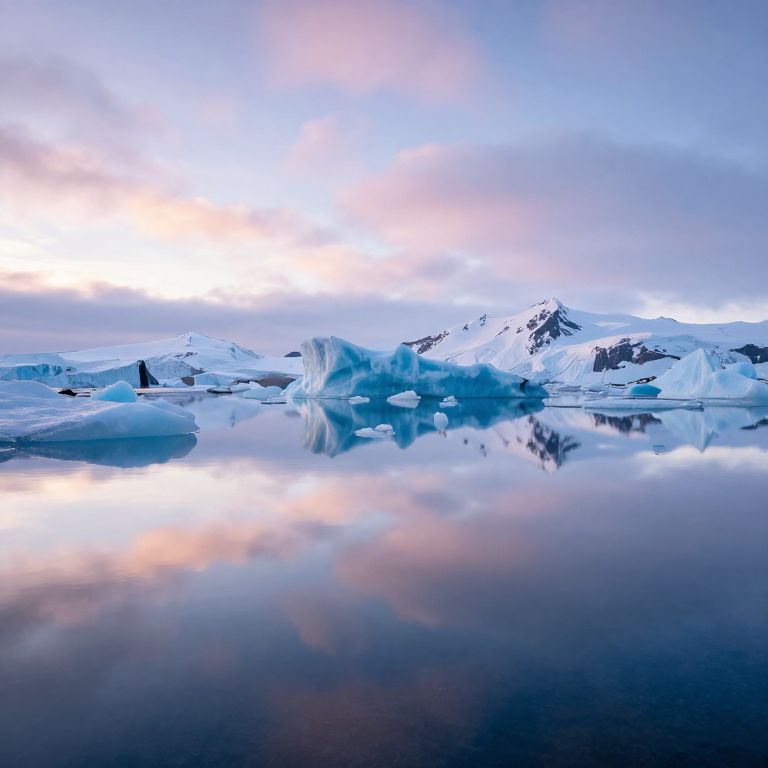 Photograph of a serene Arctic landscape at twilight. Snow-covered icebergs of varying sizes float on a calm, reflective body of water. The sky is a gradient of soft pink, blue, and white hues, with clouds adding texture. The icebergs' reflections in the water create a mirrored effect. The scene is tranquil, with the delicate colors and smooth textures emphasizing the cold, pristine beauty of the Arctic environment.