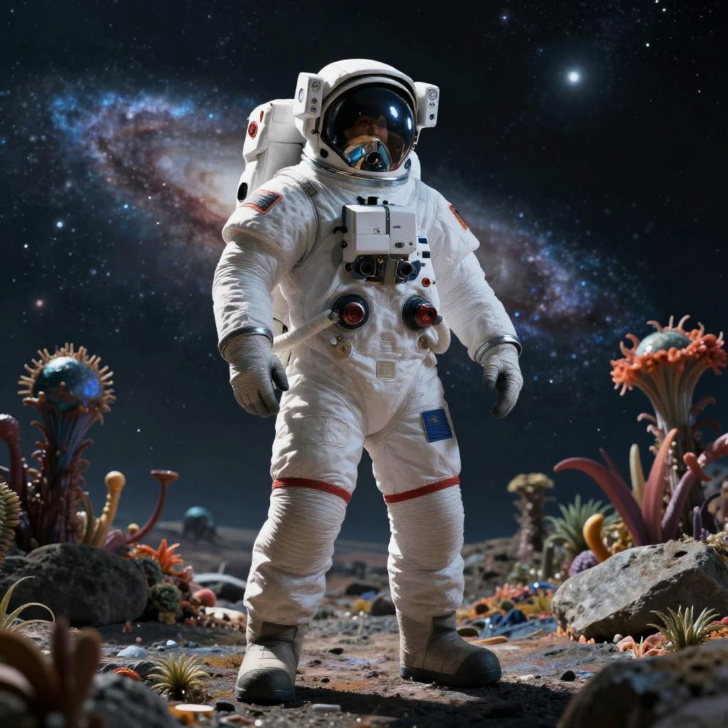 Hero prompts illustrating a heroic astronaut on an alien planet, standing confidently on rocky terrain with a distant galaxy visible in the sky, wearing a high-tech space suit and holding a futuristic device, with strange alien flora around.
