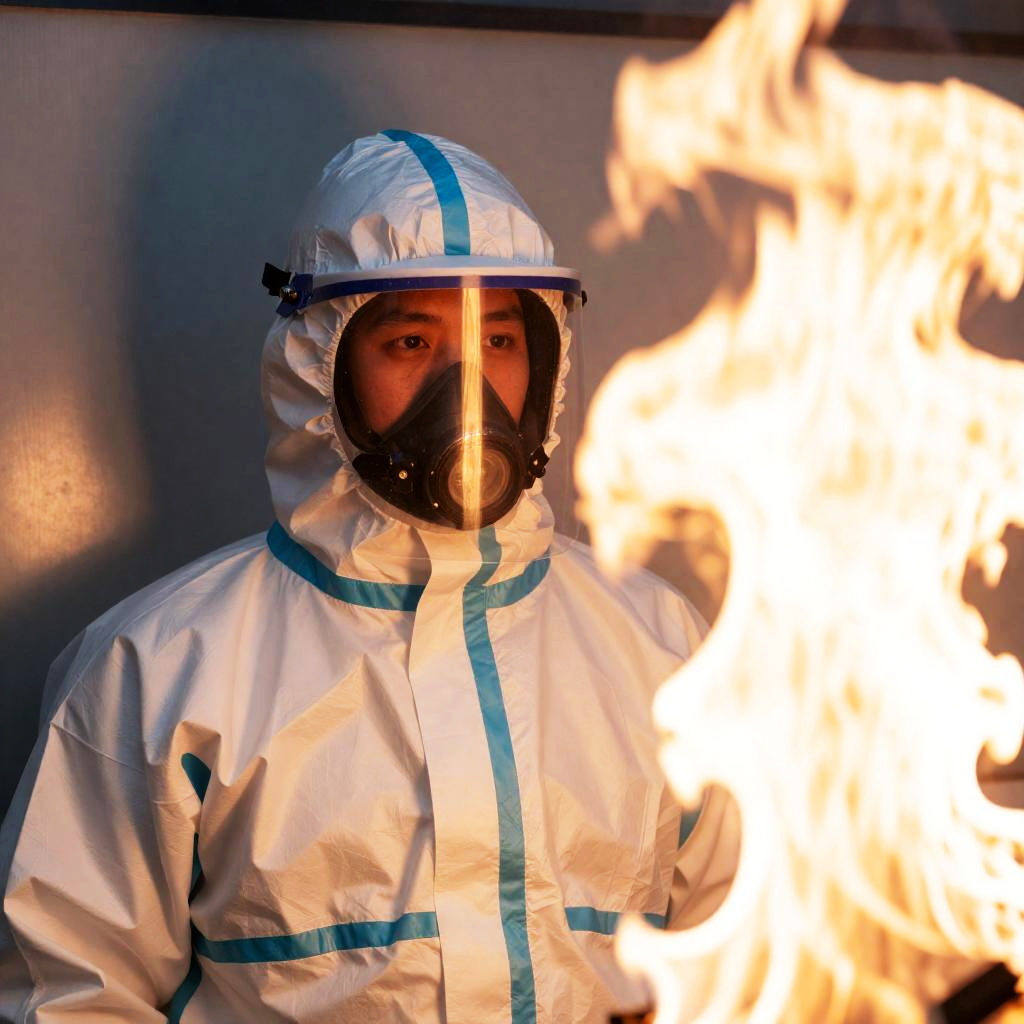 Photograph of a person in a beige hazmat suit with a clear face shield, partially obscured by bright white and yellow flames on the right. Background is a metallic surface. Person's face is visible through the face shield, showing a neutral expression. Flames dominate the right side, casting light on the suit and background.