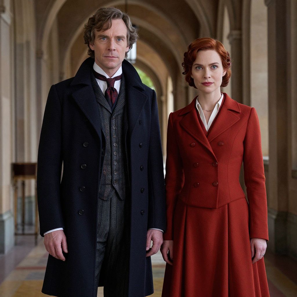 Two elegantly dressed individuals stand side by side in a grand, historic corridor, their attire reflecting the sophisticated style of the *Fantastic Beasts* film series, with the man in a navy coat and vest and the woman in a vibrant red ensemble, both exuding an air of mystery and intrigue.