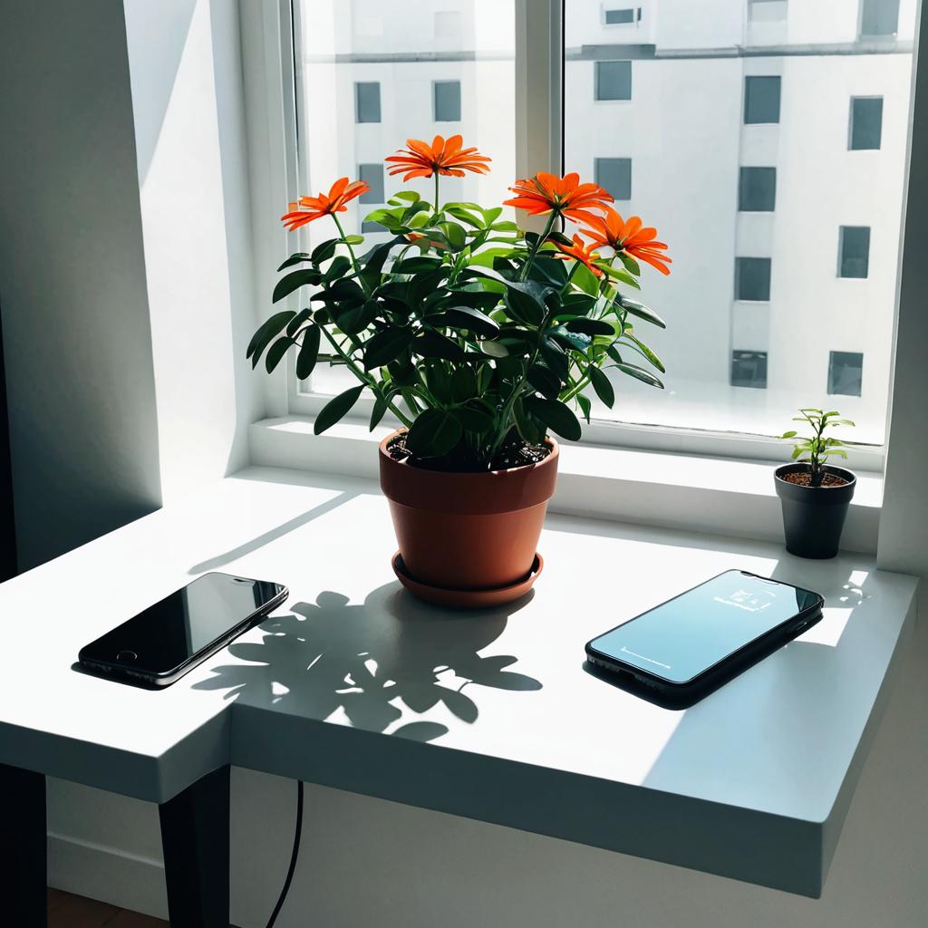Potted Flower with Smartphones on Window Table