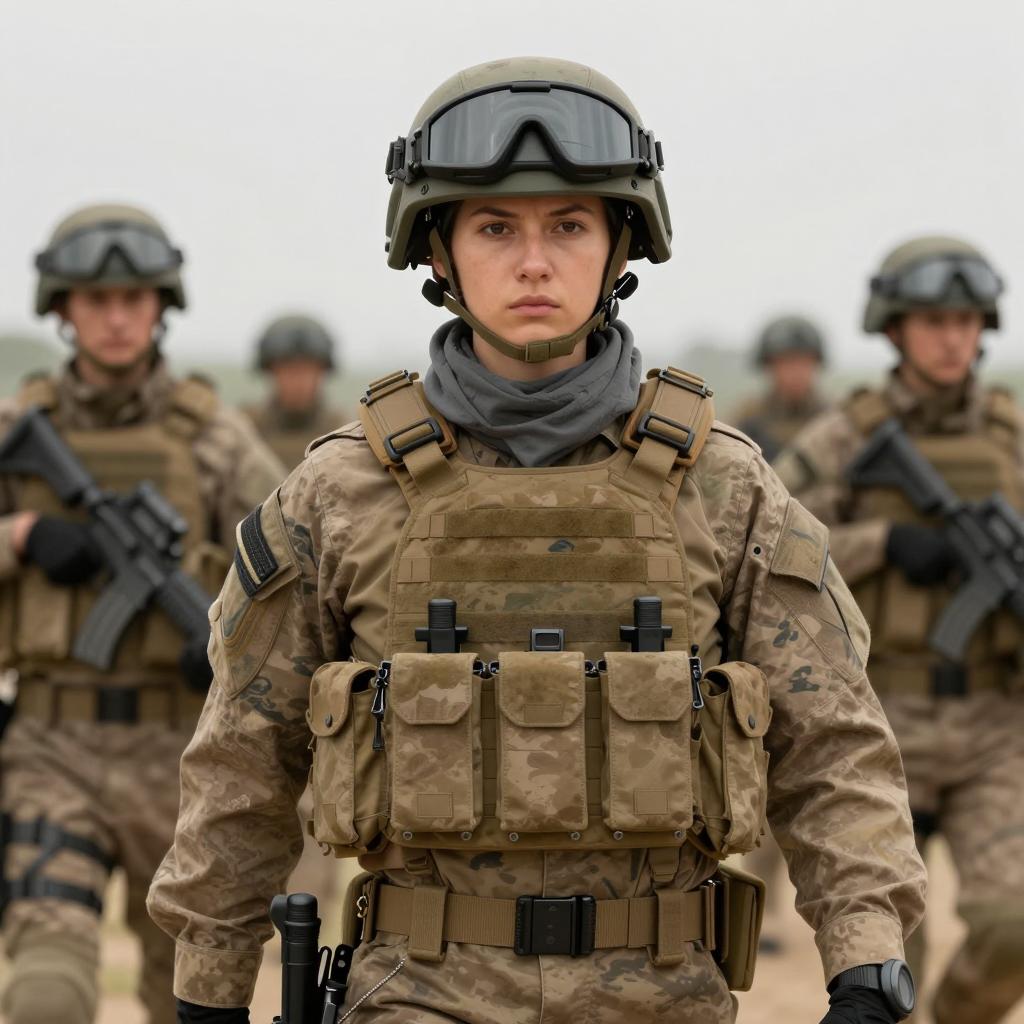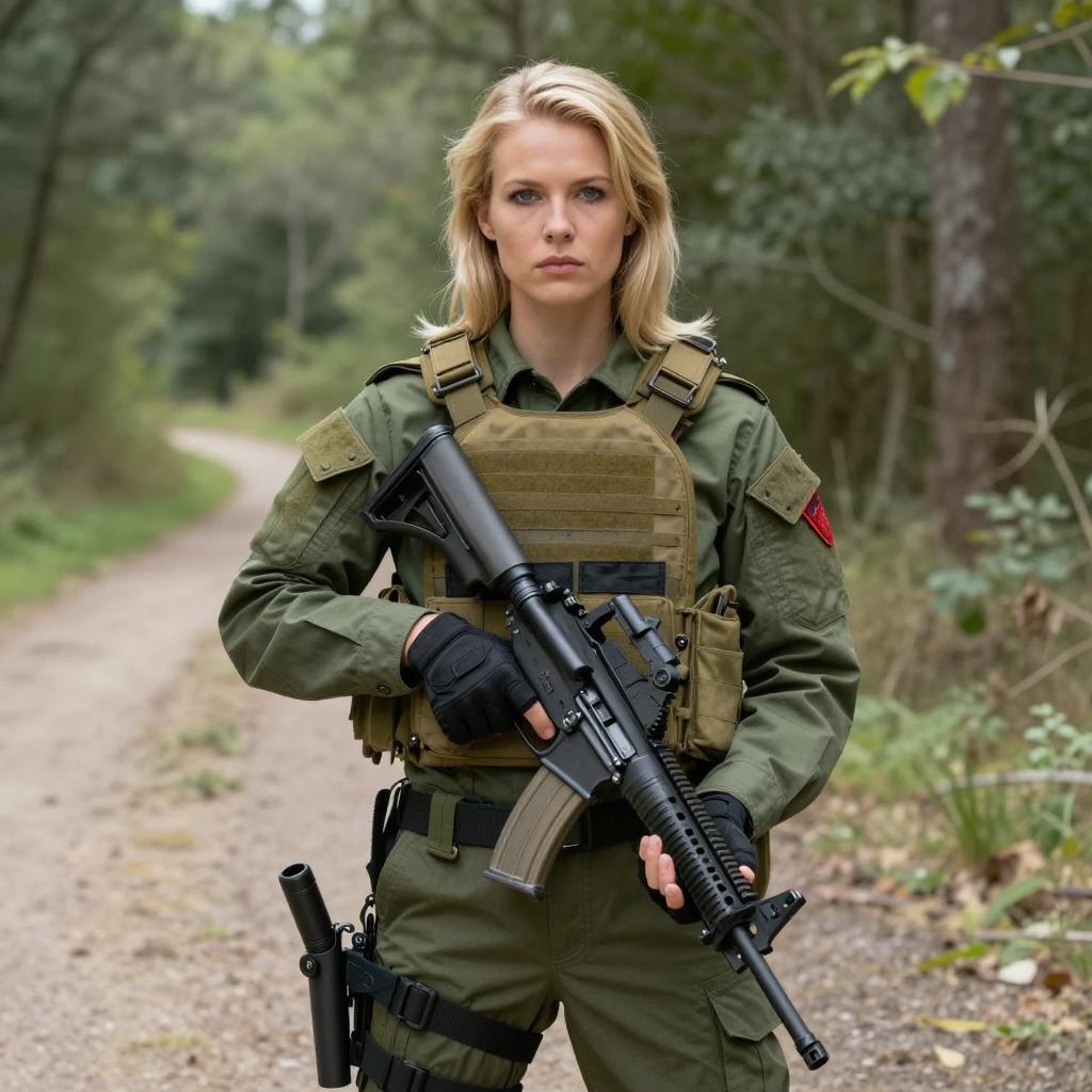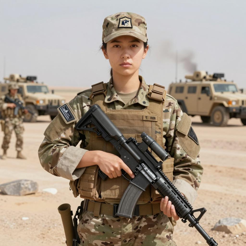 Photorealistic image of a female soldier wearing a green military uniform and tactical gear. The soldier has long brown hair styled in braids and wears an olive green cap. She is holding an assault rifle in front of her with a serious expression. The background features a stone wall with sunlight filtering through surrounding trees, in an outdoor daytime setting. The soldier also wears black military boots and gloves.