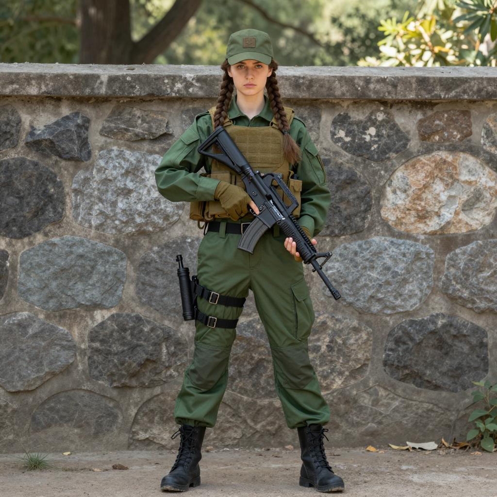 Girl army costume, photorealistic, female soldier, green military uniform, tactical gear, long brown hair in braids, olive green cap, assault rifle in front, stone wall background, sunlight filtering through trees, serious expression, realistic ures, military boots, daytime, outdoor setting, natural light, front view, centered, realistic photography style