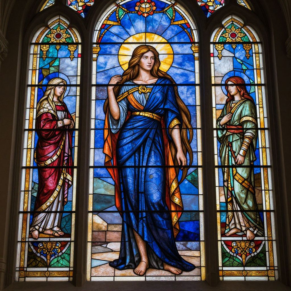 A woman with long, flowing hair stands in front of a magnificent stained glass window with intricate designs in shades of blue, red, yellow, and green, creating a beautiful and hyper-detailed illustration.