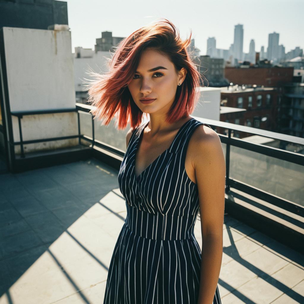 Rose Gold hairstyle on fashion model, wearing sleek blazer, in rooftop, captured in fashion editorial style with golden hour glow.