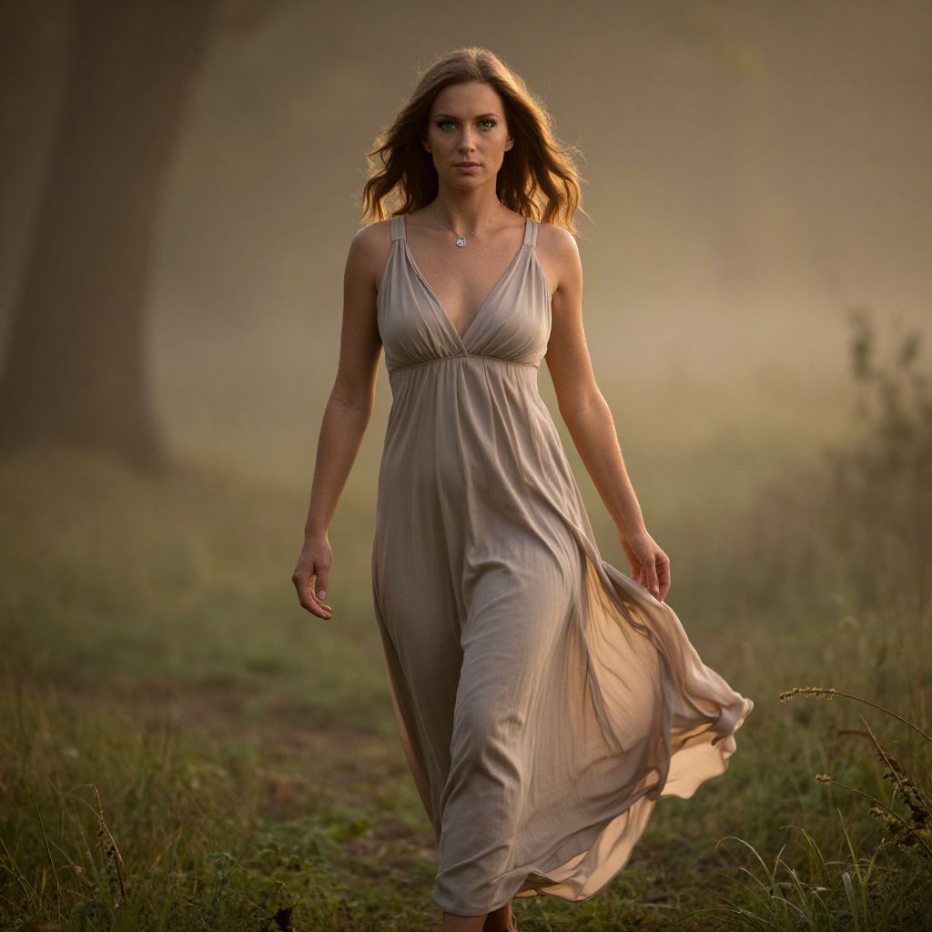 A sensual, graceful woman with medium-brown skin and deep green eyes walks through a misty forest at golden hour, her long dress flowing in the wind, glowing softly with warm ambient light, the atmosphere and her poised movements creating a strong seductive vibe balanced with natural elegance.