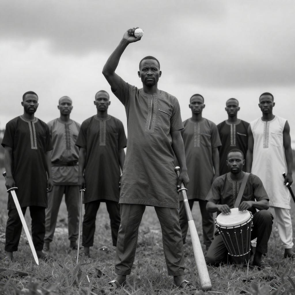 Black-and-white photograph of eight African men in traditional attire. Central figure stands with raised fist and baseball bat, intense expression. Six men stand behind, one drummer kneeling. Cloudy sky background. Various weapons, including swords, visible. Textured grass foreground.