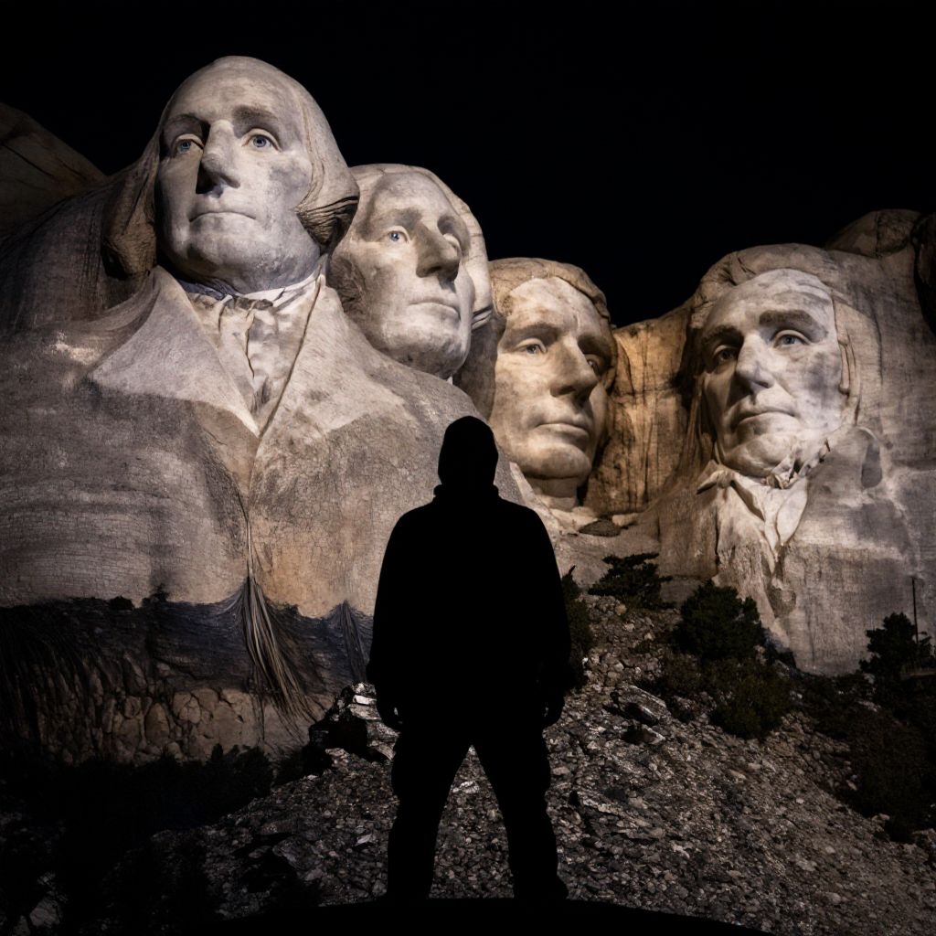 Intense low-angle shot, a solitary figure stands resolute before the iconic faces of George Washington, Thomas Jefferson, Theodore Roosevelt, and Abraham Lincoln at Mount Rushmore, bathed in moody chiaroscuro lighting, deep shadows accentuating the grandeur, mystery shrouding the scene like a cloak. Man has masculine face and piercing eyes