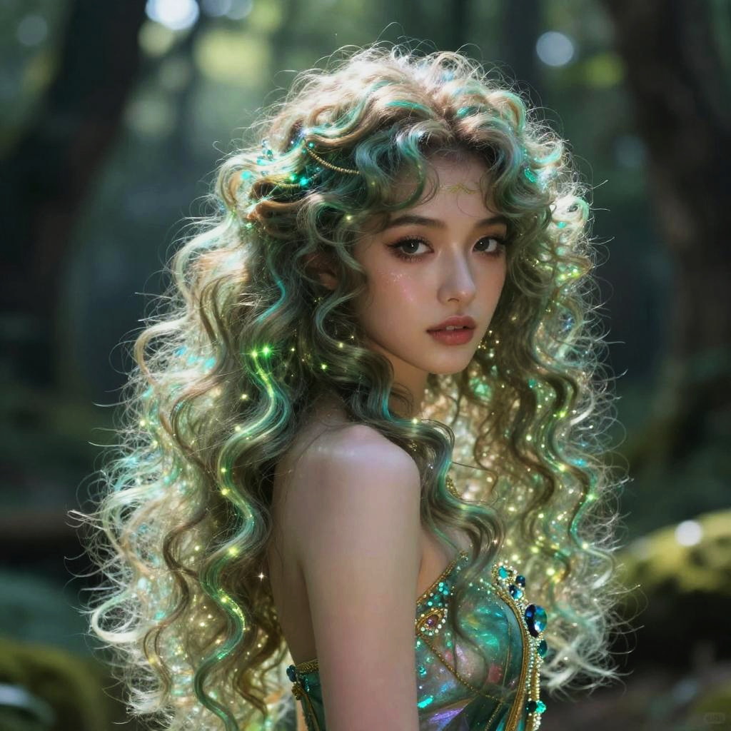 Anime women hairstyles combining fantasy elements with ethereal glow, loose curls, glowing streaks, magical forest setting, mystical atmosphere, ultra-detailed, vibrant colors