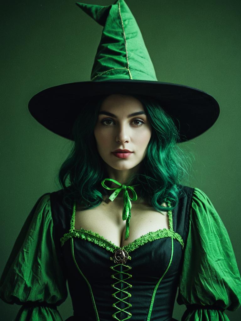 Woman in Green Witch Costume, waist-up editorial portrait, photorealistic tones
