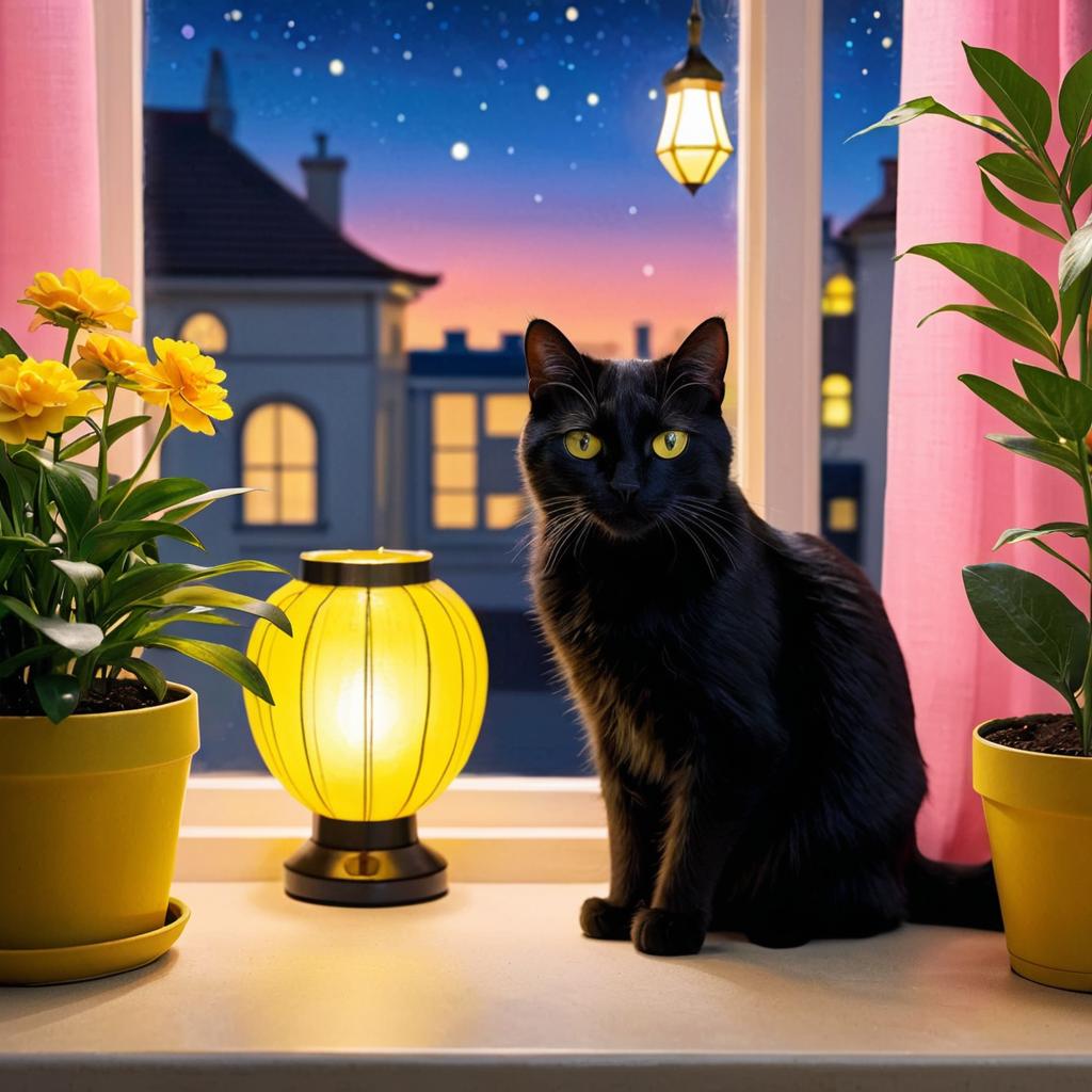 A photorealistic black cat sitting beside a vintage crescent moon-shaped cinema marquee light with flickering bulbs. The warm halo from the marquee softly illuminates the cat against a dark background, emphasizing tungsten rim lighting and subtle film grain effects.