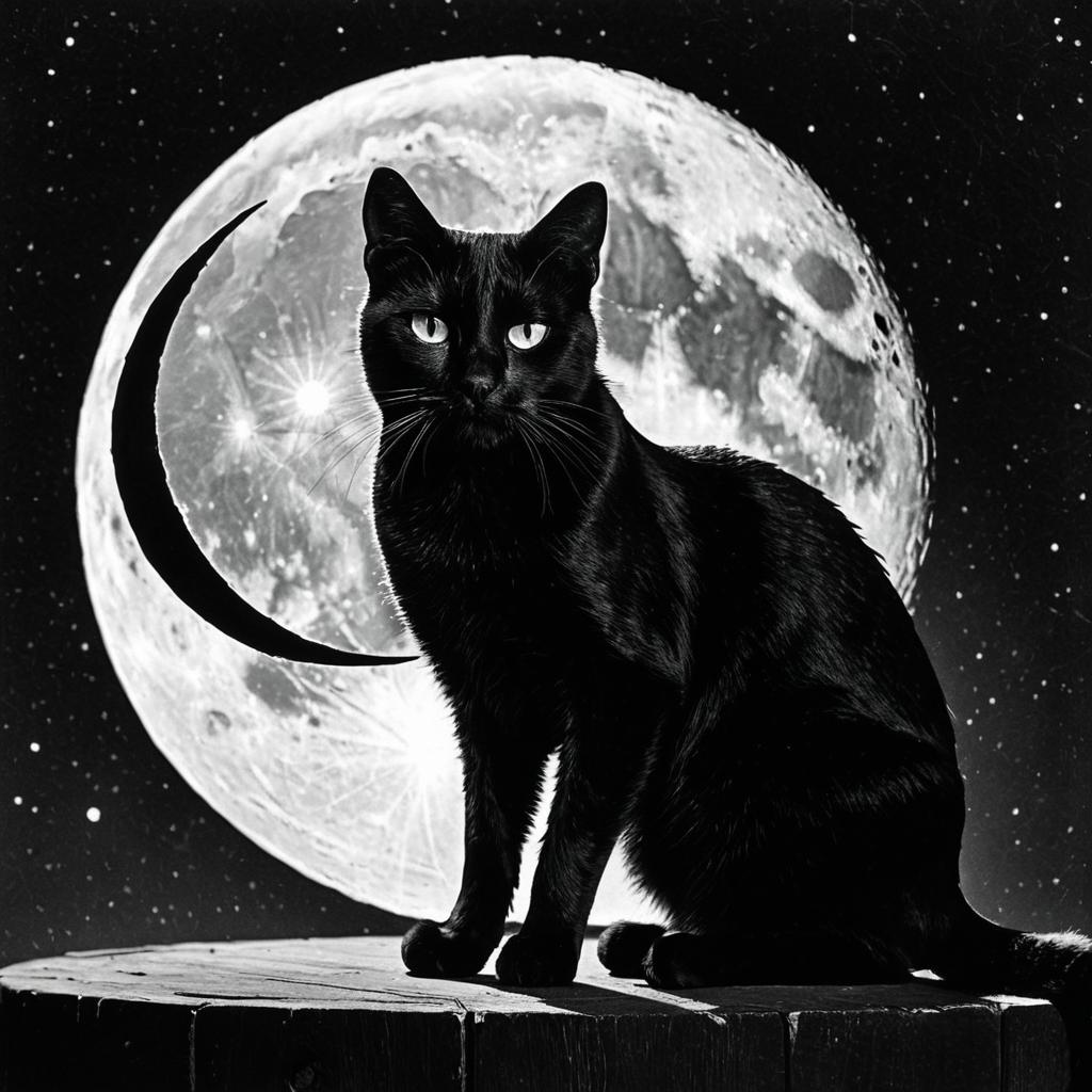 A black cat with a vintage cinema marquee shaped like a crescent moon with flickering bulbs and chipped paint, casting a warm halo over the cat, depicted in noir cinematic photorealism (tungsten rim lighting, subtle film grain, dust motes, deep low-key contrast), 3D, photorealistic.