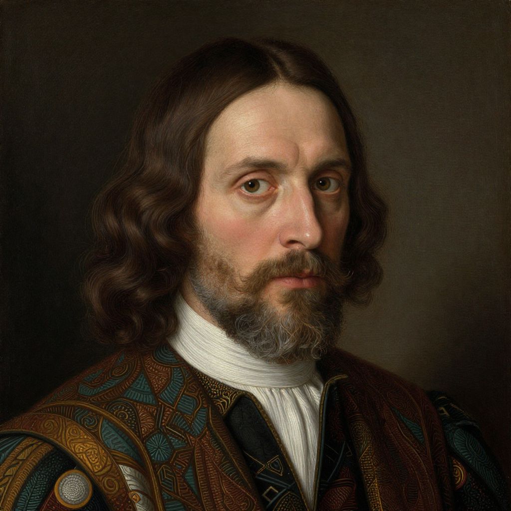 Photorealistic portrait of a middle-aged man with long, wavy brown hair, beard, and intense gaze, wearing ornate, patterned brown