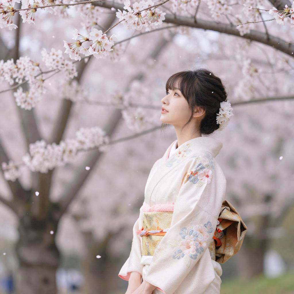 Beautifulwomen amidst blooming cherry blossom trees in full spring bloom, traditional kimono with elaborate embroidery, soft pink petals falling gently, peaceful and romantic mood, delicate brushstroke style, luminous natural light, harmonious color palette