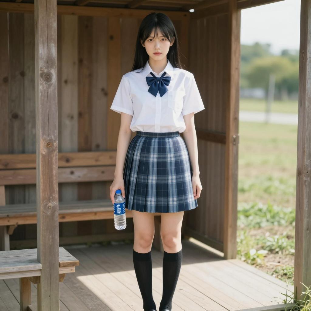 Young Japanese woman with long straight black hair wearing a white blouse, purple striped bowtie, plaid skirt, and black knee-high socks. She carries a brown shoulder bag and holds white pom-poms in each hand. Standing on a sunny sidewalk next to green bushes with blurred urban background, smiling in casual pose with sunlight highlighting her face and hair during daytime.