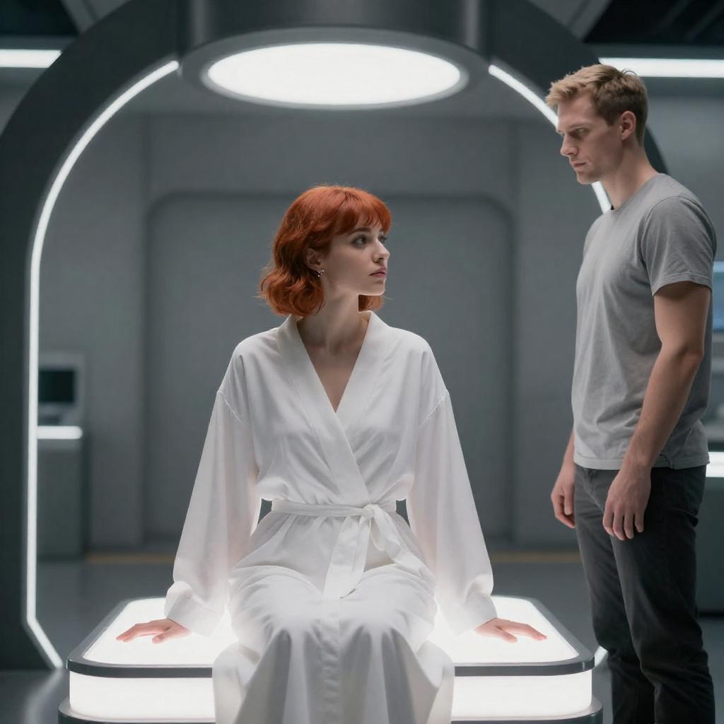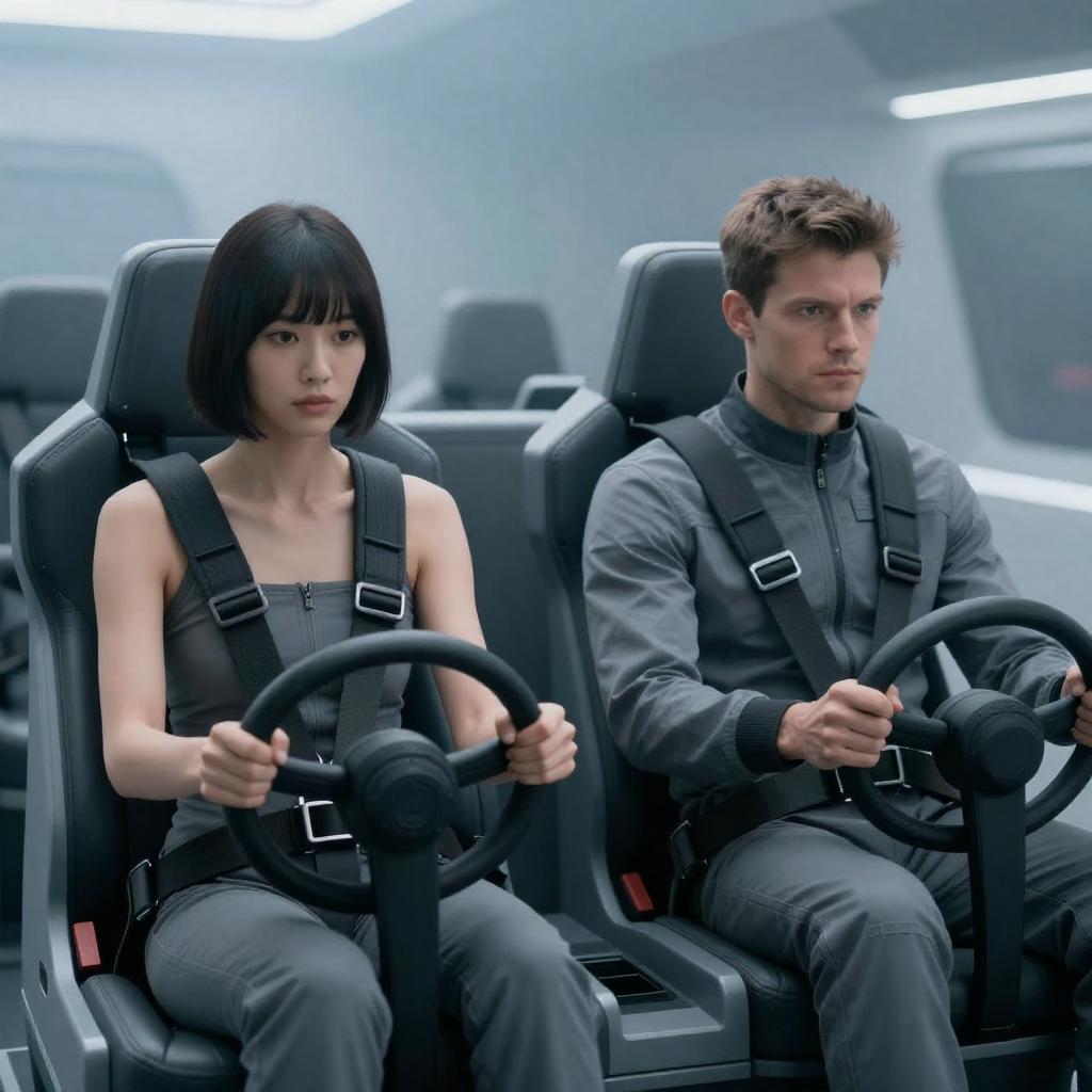 Photograph of two people in futuristic, grey, padded seats with harnesses. Both hold steering wheels. The woman has short black hair, visible collarbones, and a focused expression. The man has short brown hair, intense expression, and a serious gaze. Background is a misty, blue-lit environment. Both wear grey outfits with black accents.