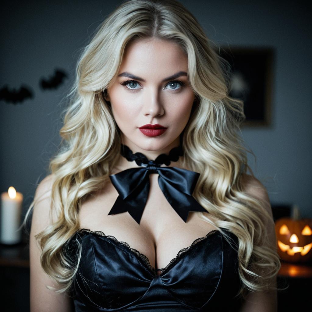 Scariest halloween costume,1girl, solo, long hair, realistic, blonde hair, choker, wavy hair, photorealistic, lips, looking at viewer, bow, upper body, breasts, dress, grey eyes, blurry