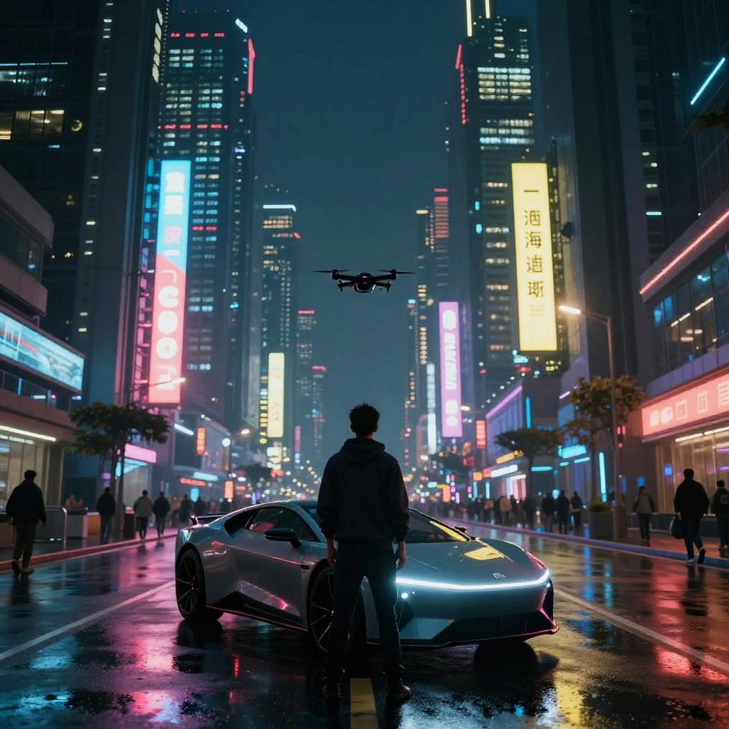 Cyberpunk Night with Futuristic Car and Drone