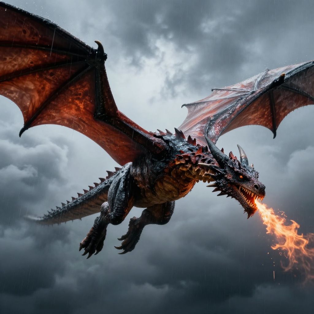 Realistic flying dragon gliding through stormy skies, thunderclouds swirling around massive wings, wet scales glistening with rain droplets, sharp claws extended, fiery breath visible, dramatic lighting with high contrast, hyper-detailed fantasy creature in motion.