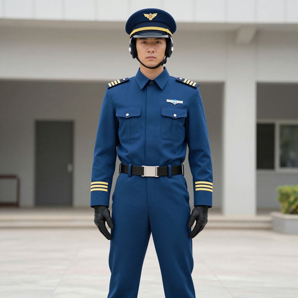Blue Squadron Pilot Costume, man in a blue uniform and helmet standing in front of a building