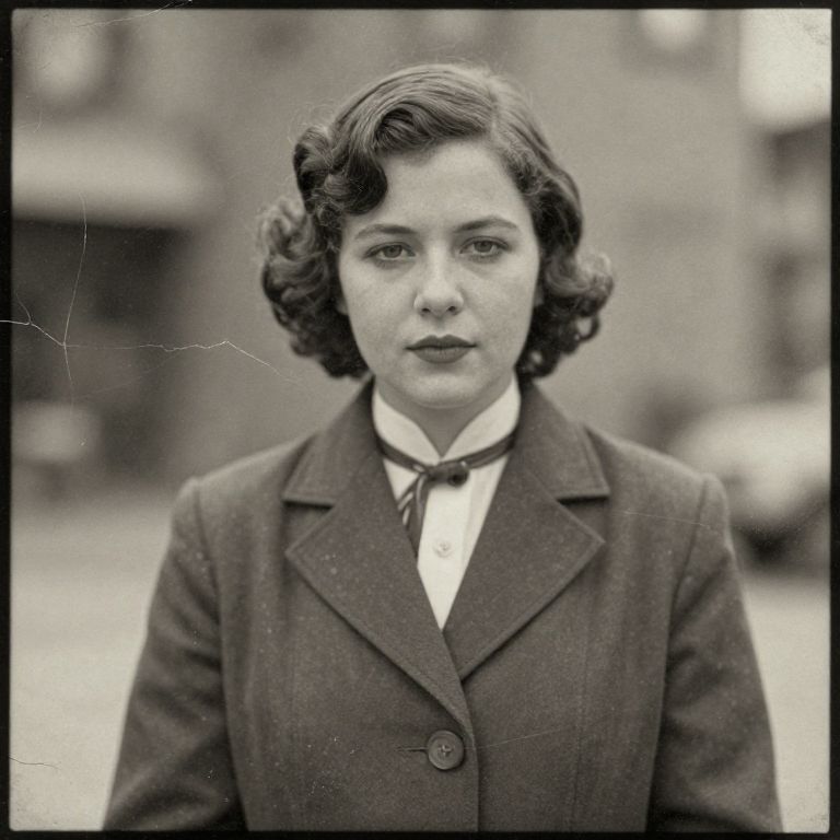This black-and-white photograph features a young woman with short, wavy dark hair and dark lipstick, standing outdoors. She wears a dark, textured wool coat with a double-breasted design over a white shirt adorned with a black ribbon tie. Her expression is serious and slightly stern. The background is blurred, showing indistinct shapes of buildings and a vehicle, suggesting an urban setting. The image has a vintage, early 20th-century feel, with visible grain and slight scratches on the photograph's surface. The overall texture is soft and slightly faded.