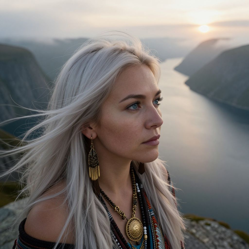 A photorealistic portrait of an enigmatic Native American woman with piercing blue eyes and long, platinum hair flowing in a gentle breeze, captured from an aerial perspective in close-up three-quarter view, exudes serenity and mystery as she gazes upon the shimmering waters of a misty Scandinavian fjord. The soft golden light of dawn bathes her flawless skin, casting subtle shadows that enhance the intricate details of her delicate gold jewelry. This captivating portrayal invites viewers to uncover the untold stories hidden within her expressive gaze, while the vast landscape behind adds depth and drama to this compelling scene.