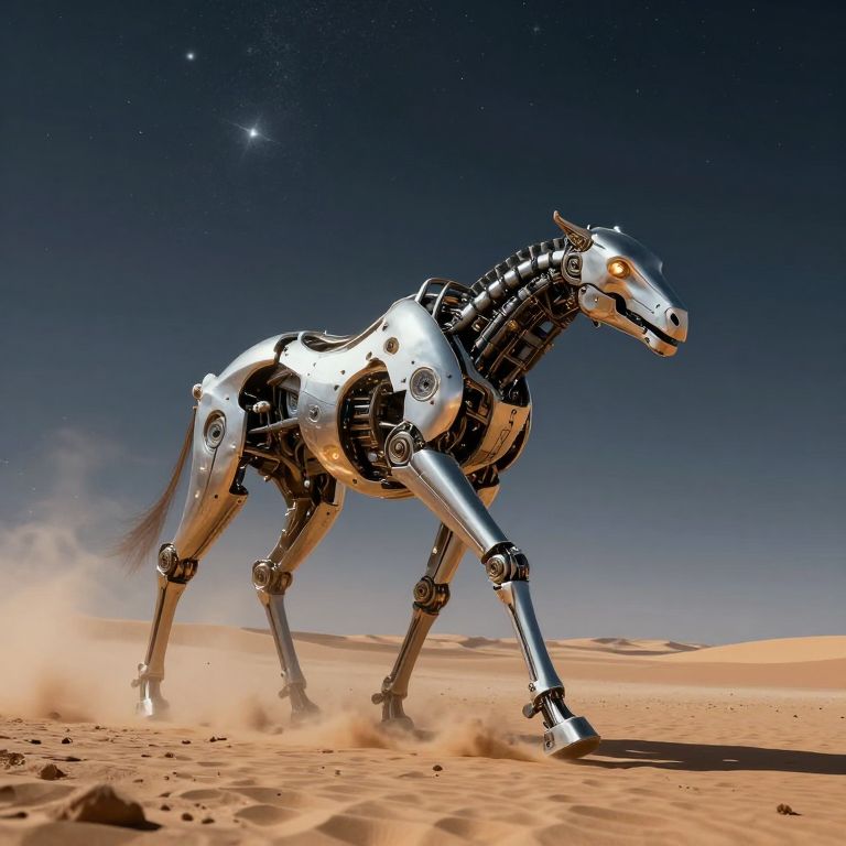 This is a CGI image of a futuristic robotic horse standing in a desert under a starry night sky. The robot has a sleek, metallic silver body with exposed mechanical parts, including gears, wires, and joints. Its head is horse-shaped with glowing orange eyes and an open, mechanical mouth. Dust kicks up from its hooves as it strides across the sandy, dune-covered ground. The background shows a clear, deep blue sky with a few bright stars. The robotic horse's design combines organic and mechanical elements, blending futuristic technology with a natural horse form.