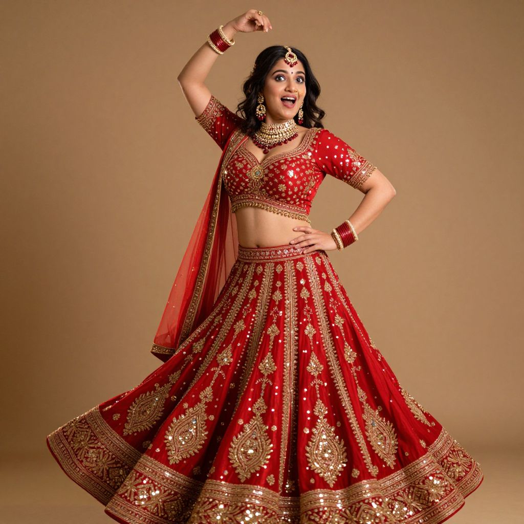 Photograph of a South Asian woman in a vibrant red and gold traditional lehenga-choli, adorned with intricate embroidery, posing confidently against a beige background