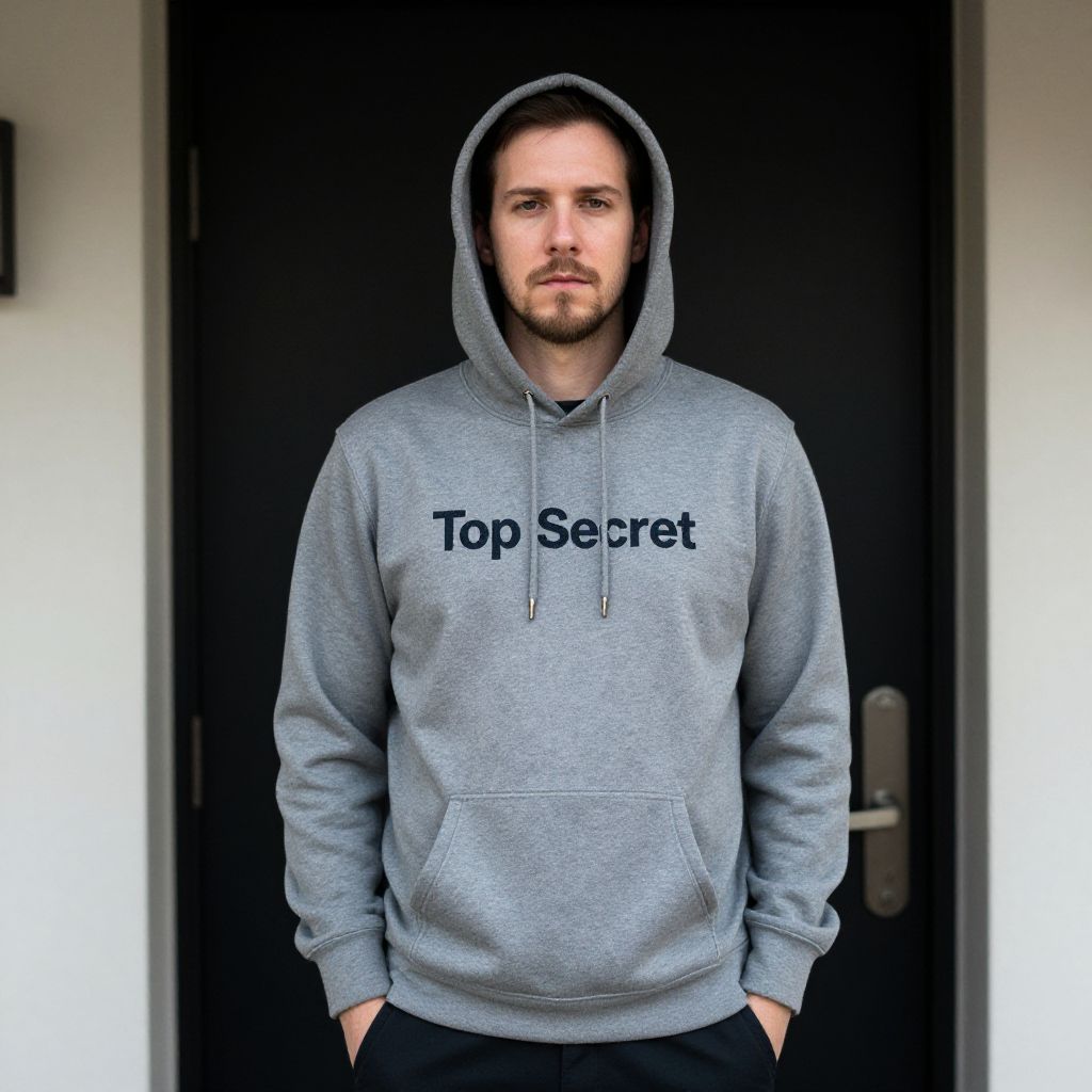Photograph of a Caucasian man standing in front of a black door. He has light skin, a short beard, and brown hair. He is wearing a gray hooded sweatshirt with "Top Secret" printed in bold black letters across the chest, and black pants with his hands in his pockets. The sweatshirt has a drawstring and a front pocket. The background is minimalistic with a white wall on the left and the black door in the center. The lighting is even, highlighting the subject clearly. The overall style is casual and contemporary.