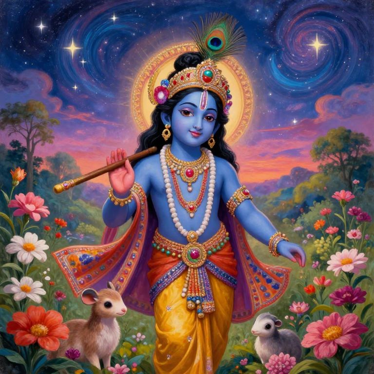Khrishna in a celestial garden, adorned with a peacock feather crown and ornate garments, surrounded by blooming flowers and gentle animals, under a twilight sky filled with stars and swirling cosmic patterns, vibrant color palette, painterly texture.
