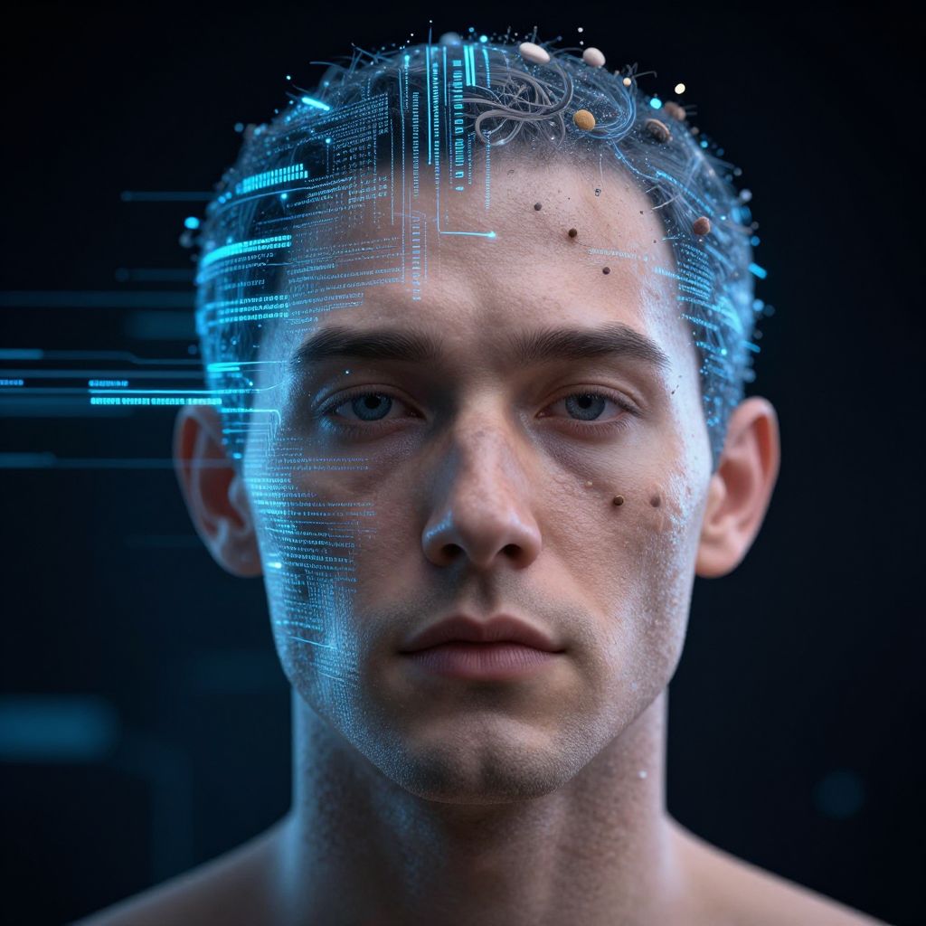 Photograph of a young, fair-skinned man with short, dark hair and blue eyes, gazing directly at the camera. His face is partially covered with a transparent, blue digital overlay of lines, dots, and small icons, resembling a computer interface. The background is black, highlighting the blue digital elements. The man's expression is neutral, and he is shirtless, revealing a smooth, slightly muscular neck. The overall style is futuristic and cybernetic, blending human and digital elements. The lighting is focused on his face, creating a stark contrast with the dark background.