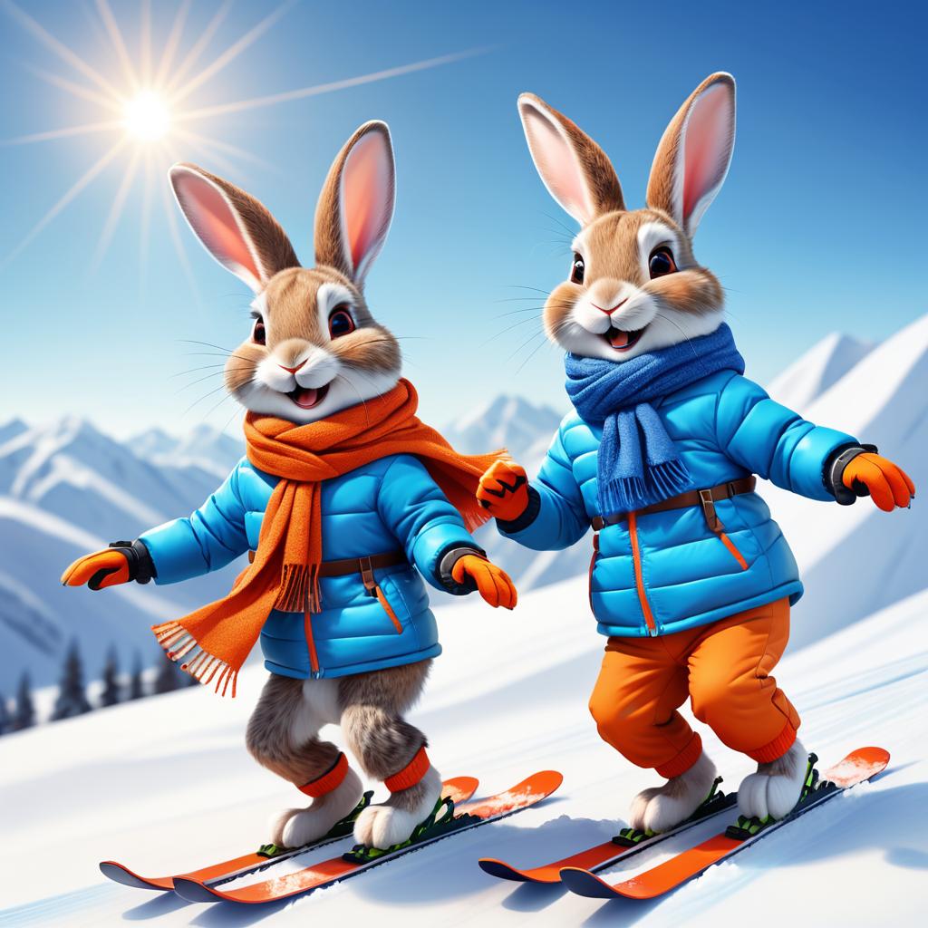 Two cute cartoon rabbits skiing downhill on a snow-covered mountain. Both rabbits are wearing bright blue winter jackets. One rabbit has an orange scarf and gloves, while the other has a blue scarf and orange gloves. The scene is set under a clear blue sky with bright sunlight highlighting their fluffy fur and joyful expressions, creating a playful and whimsical winter atmosphere.
