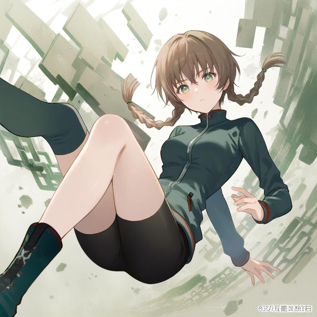 Amane suzuha, steins;gate, 1girl, yellow eyes, green eyes, brown hair, long hair, twin braids, medium breasts, bike shorts, by artist fukahire (ruinon), animagine