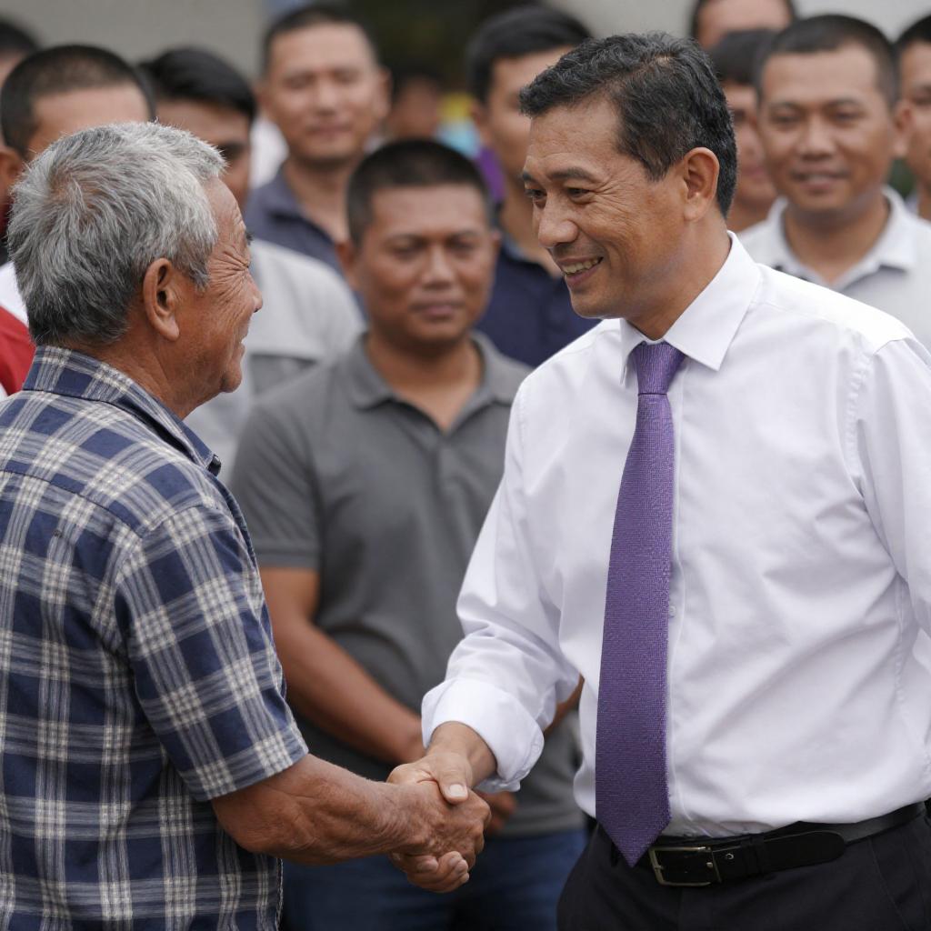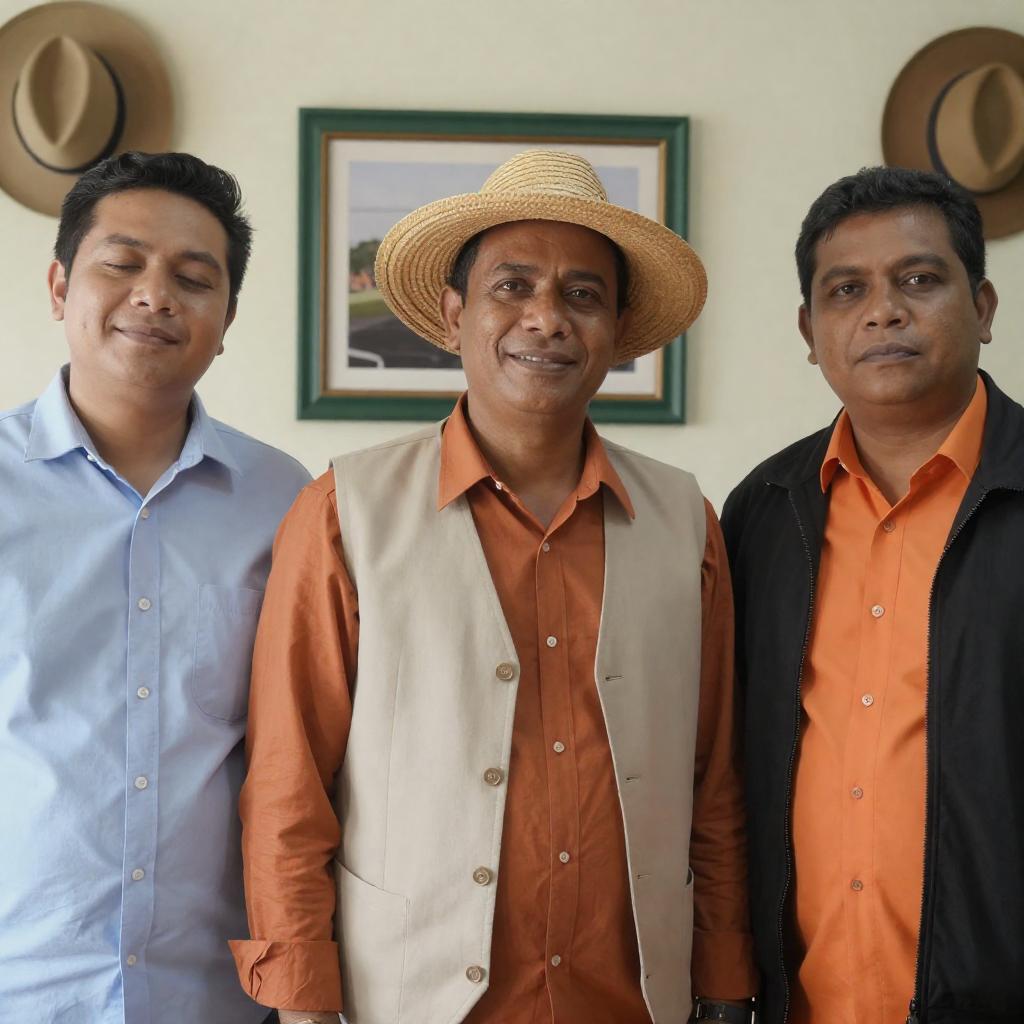 Photograph of two men standing side by side. The man on the left wears a beige blazer over a light blue shirt, dark pants, and sunglasses. The man on the right wears a black suit, blue shirt, and sunglasses, holding a plastic bag in his right hand. Background includes a fence, green foliage, and colorful mural with shoes. Both men have neutral expressions. Sunlight casts shadows.