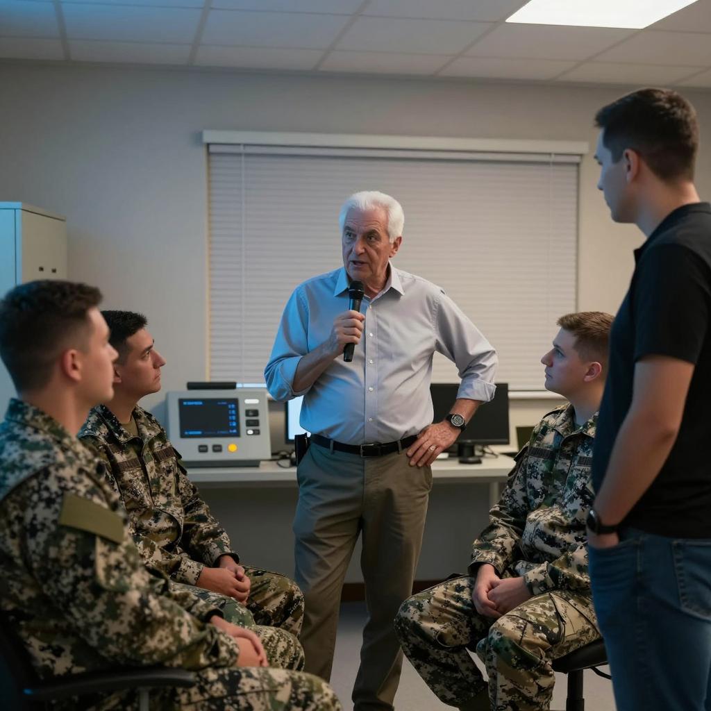 Six male military personnel in beige uniforms. One man with a red cap and name tag sits, leaning back, while others stand around him, listening intently. One man holds a clipboard. Background includes illuminated control panels. All men have short hair, with one man having curly hair. The man with the cap looks to the side.