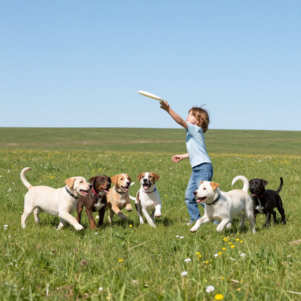 Surrounded by puppies on a bright green meadow under a clear blue sky, a child throws a frisbee as a mix of energetic puppies chase after it, wildflowers dotting the landscape, invoking a sense of freedom and pure joy in nature's embrace.