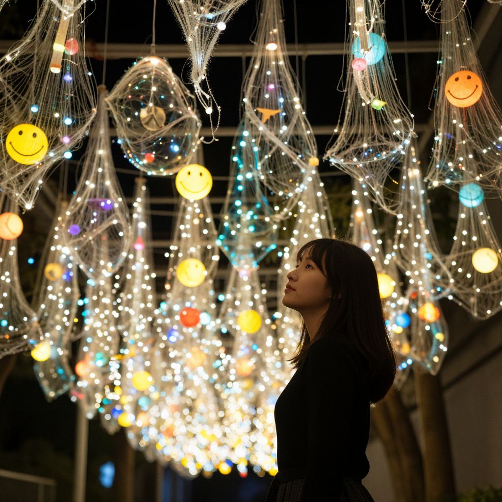 A young woman stands beneath a whimsical canopy of glowing lanterns adorned with radiant smiles, each suspended by ethereal ropes that seem to weave emotions into tangible, luminous forms.